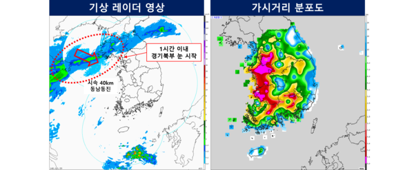 29일 기상청에 따르면 북서쪽에서 남동진하는 기압골에 의해 형성된 강수구름대가 서해상에서 시속 40㎞m로 동남동진중이어서 오전 10시 무렵 경기북부에 눈이 내리기 시작하겠다. 이어 강원 영서북부에 11시 무렵, 서울에서 낮 12시 전후에 눈이 내리겠다.