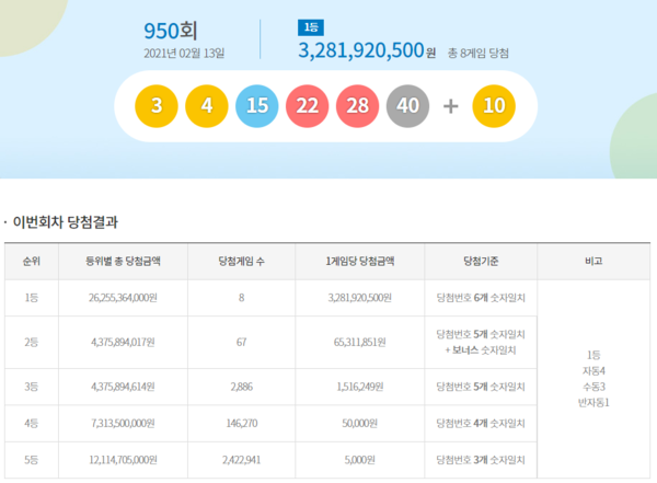 로또 950회 당첨번호 6개를 모두 맞힌 1등 당첨자는 8명이며 각 3,281,920,500원의 당첨금을 받는다.