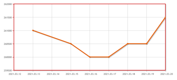 1주일 전 지난 13일 한국 표준 금거래 시세는 순금 3.76g(1돈) 기준 26만1,000원에서 20일 26만1,500원으로 500원 올랐다. 이 가격은 살 때 가격이며 팔 때는 26만1,000원을 나타내고 있다. 18K 팔 때 가격은 18만7,900원이며 14K 팔 때 가격은 14만4,800원이다.