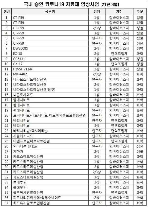 [매일안전신문] 국내에서 승인받은 코로나19 치료제 임상시험계획이 총 37건인 것으로 집계됐다.