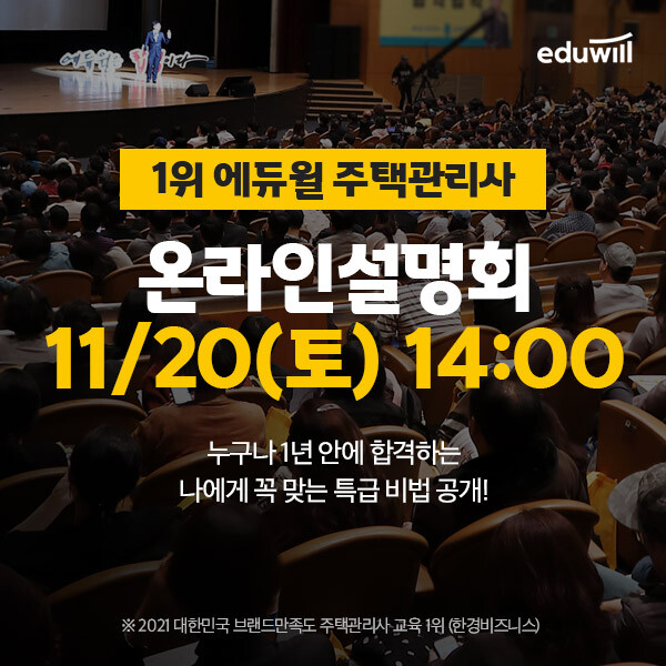 오는 20일 오후 2시, 종합교육기업 에듀윌(대표 박명규)은 주택관리사 시험 대비 ‘2022년 온라인 설명회’를 유튜브 생방송으로 개최한다.