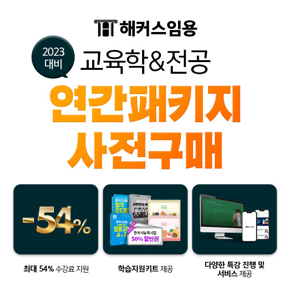 해커스임용은 오는 12월 31일까지 2023학년도 대비 ‘교육학&전공 연간패키지’ 사전 구매 이벤트를 진행한다고 밝혔다.