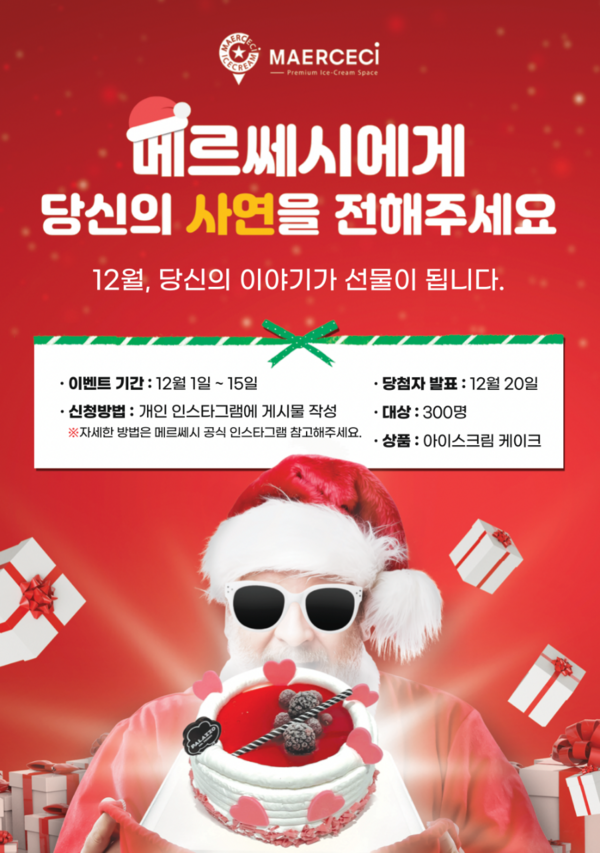 아이스크림 할인전문점 메르쎄시(MAERCECI)가 12월을 맞아 아이스크림케이크 증정 이벤트를 진행한다고 밝혔다.