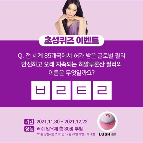 초성퀴즈 정답을 맞추고 추첨을 통해 당첨된 30명에게 러쉬 입욕제가 증정된다. 최종 당첨자는 오는 24일 개별 고시될 예정이다.